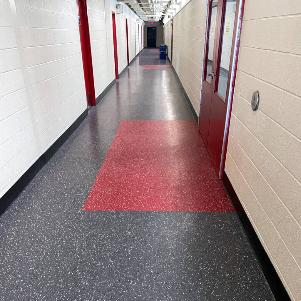 Skate-resistant rubber flooring in an arena ice rink corridor